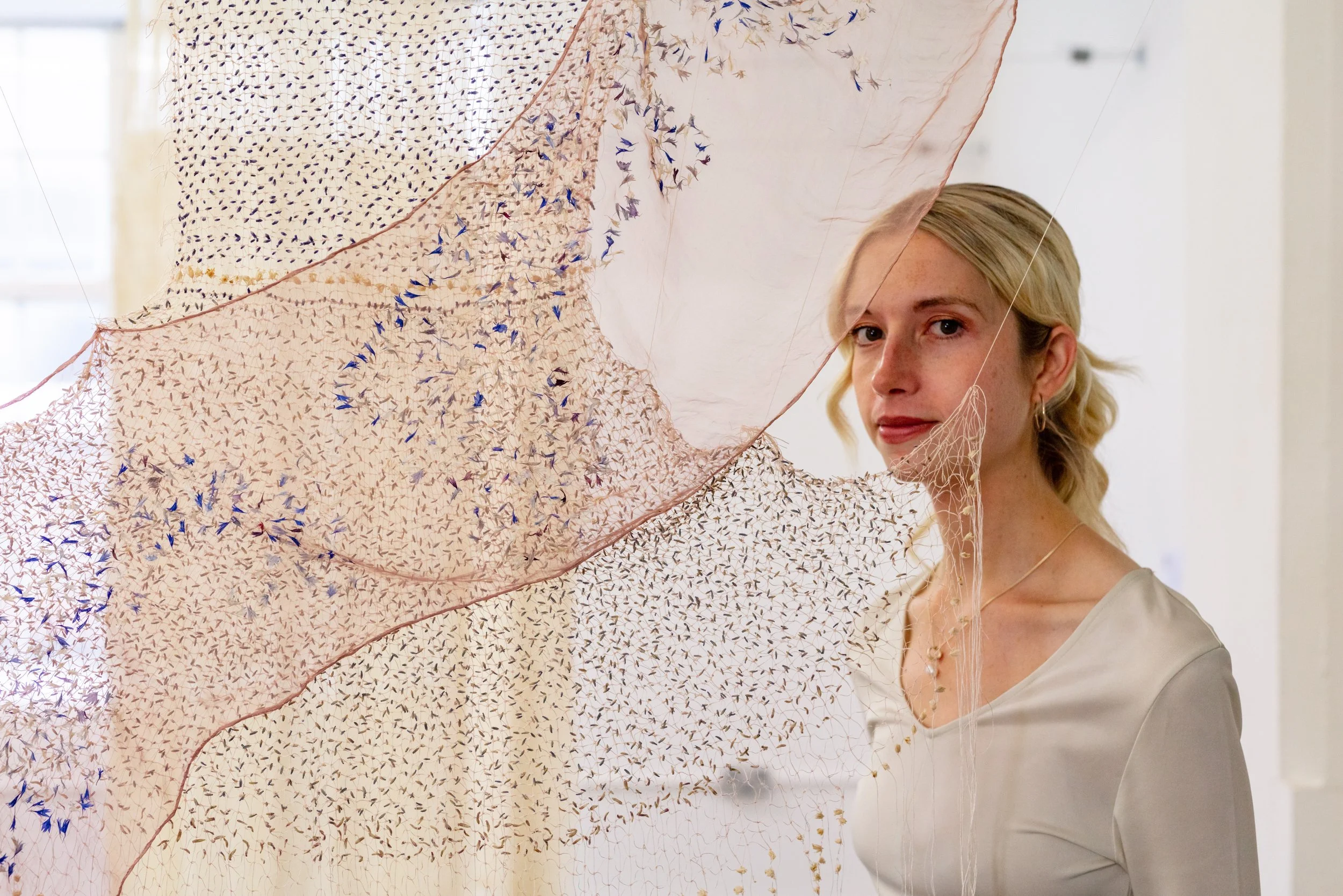 Katerina’s practice delicately blends nature and craft. In 2022, she spent time working in the archive of The Lace Guild Museum in Stourbridge, the largest lace organisation in the UK. Learning about “Punto in aria”, an early form of Italian needlelace, translating to “stitch in air”, inspired her to reinterpret the intricacy of needlelace techniques, through her own artistic language — intertwining horticulture and textile, flora and thread.